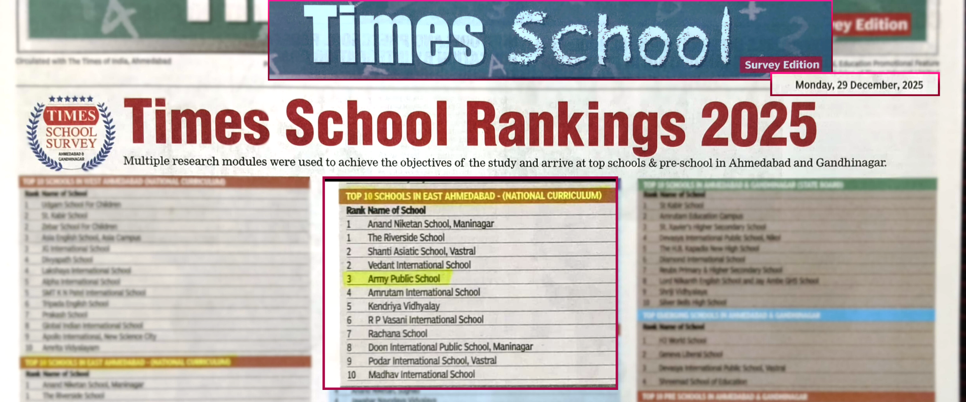 Army Public School, Ahmedabad is affiliated with the Central Board of Secondary Education (CBSE) and is a part of the Army Welfare Education Society (AWES).